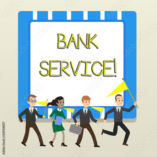 © A, Obraz premium Word writing text Bank Service. Business photo showcasing Activities involved in accepting and safeguarding money by bank People Crowd Flags Pennants Headed by Leader Running Demonstration Meeting