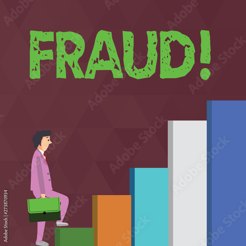 Obraz premium Word writing text Fraud. Business photo showcasing Criminal deception to get financial or demonstratingal gain Businessman Carrying a Briefcase is in Pensive Expression while Climbing Up