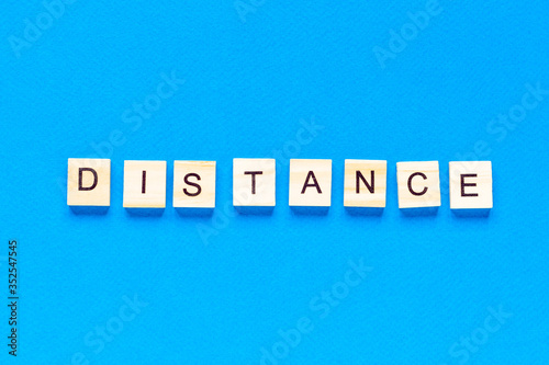 Obraz premium Words distance. Wooden inscription on a blue background. Information sign of distance from blocks on a blue background.