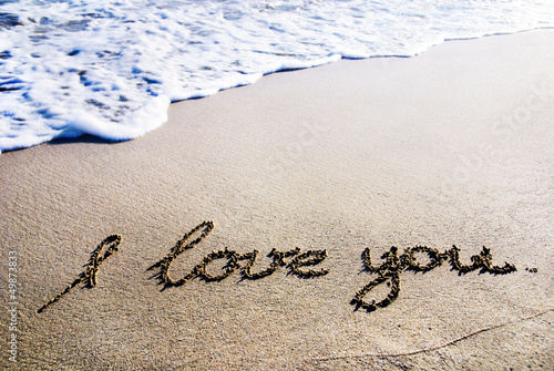 © EMrpize, Fototapeta premium words "I love you" outline on the wet sand with the wave brillia
