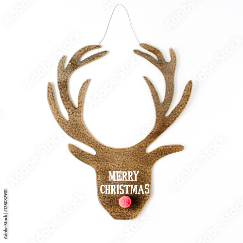 © Floral Deco, Obraz premium words merry christmas and toy head of christmas deer on white background. flat lay, top view