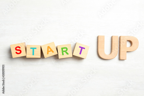 © New Africa, Obraz premium Words START UP made with wooden blocks on white background, flat lay