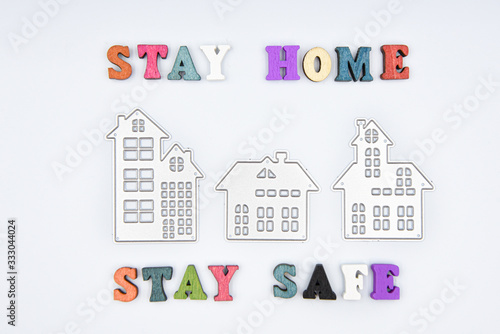 Fototapeta premium Words Stay home Stay safe made from wooden letters and three metalic houses, concept of self quarantine at home as preventative measure against corona virus Covid 19 outbreak.