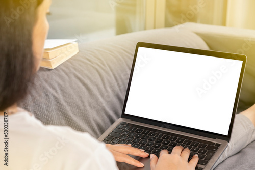 Fototapeta premium Work at home, young brunette woman work at home. Holding modern laptop for mock up, blank white screen. Hands on keyboard typing, browsing, designing, coding. Morning light with copy space area.