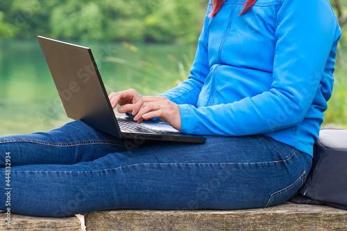 © Ilja, Naklejka premium Work from anywhere. Remote freelancer work in nature. Young woman, female freelancer working with laptop with Beautiful view of forest and lake. freelancer paradise, freedom of teleworking. distance