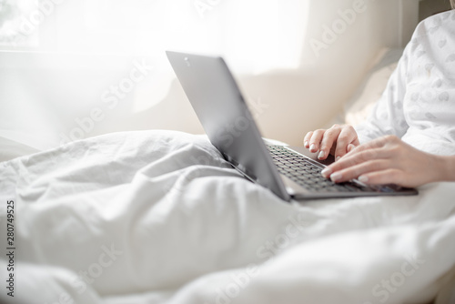Fototapeta premium Work from home concept . Blonde Giirl typing and using laptop. Hygge...