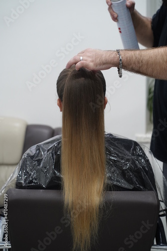 © superbupermaxim, Naklejka premium Work in a hairdressing salon. High tail. Measurement with fingers by hairdresser before start.