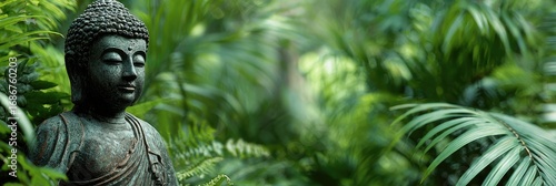 © Vlad, Obraz premium Work-Life-Balance with Smiling Buddha Statue in a Fresh Tropical Garden