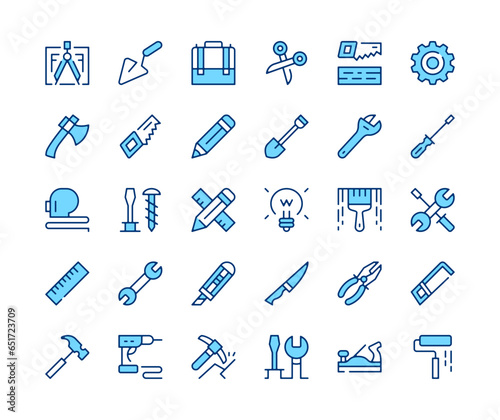 Obraz premium Work tools icons set. Vector line icons. Blue color outline stroke symbols....