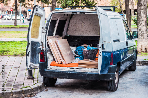 © Krent Arte, Naklejka premium Work van with the door open in the back with working tools inside