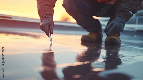 Obraz premium Worker Applying Sealant on a Reflective Surface