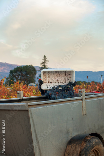 © Cavan, Naklejka premium Worker dumping hand picked grapes from bucket to grape bin