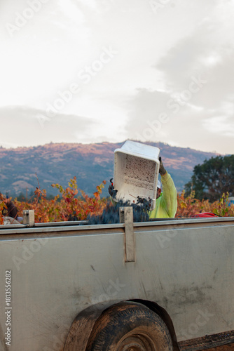 © Cavan, Naklejka premium Worker dumping hand picked grapes from bucket to grape bin