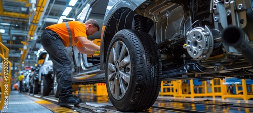 © spyrakot, Fototapeta premium Worker Engineer Ensuring Proper Car Drivetrain Alignment on Factory Assembly Line