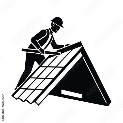 © sk, Obraz premium Worker Fixing Roof Tiles Roofing Vector Art