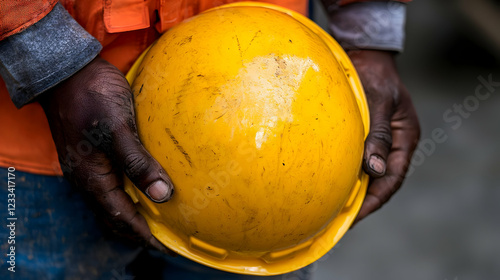 © tugkiara, Fototapeta premium Worker holding hard hat, construction site