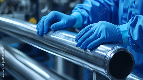 © aubriella, Obraz premium Worker in Blue Gloves Handling a Metal Pipe in an Industrial Setting