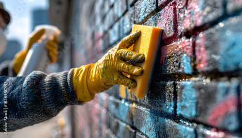 © john, Obraz premium Worker in protective mask, gloves scrubs graffiti from brick wall using cleaning spray, sponge. Professional cleaning service restores building facade. Hygiene, sanitization for outdoor surfaces.