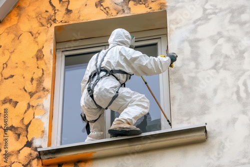 © AHNH3, Naklejka premium Worker in Protective Suit Cleaning Window with Orange Wall Background