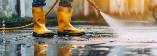 © Irina, Fototapeta premium Worker in rubber boots cleaning driveway wallpaper background