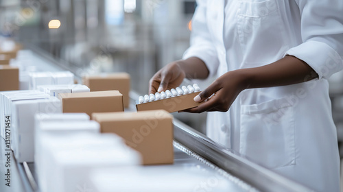 Obraz premium Worker Packing Pills in Factory Shipping Boxes