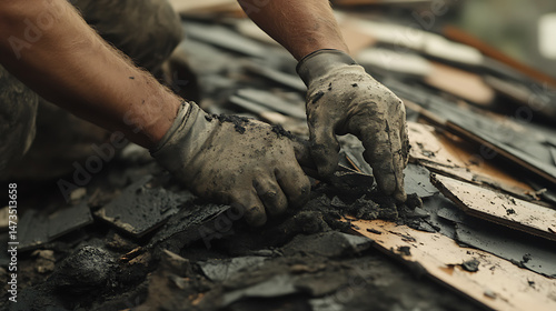 Obraz premium Worker's Hands Sorting Through Burnt Debris