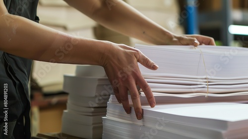 Obraz premium Worker stacking finished paper products, close view of hands and stack, clear...