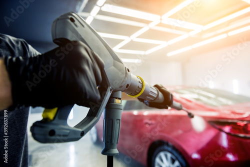 Fototapeta premium Worker washing car with high pressure water at a car wash.