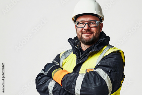© 月 明, Fototapeta premium Worker wearing hard hat smiling positively