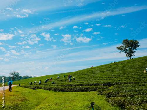 © JonGRakk, Obraz premium Workers are collecting tea on the hillside, behind the bright sky.