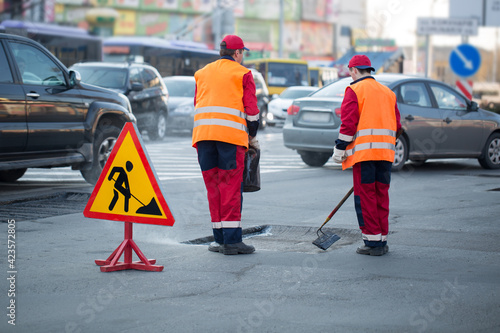 © Studio Peace, Fototapeta premium Workers are leveling asphalt on construction site road repair