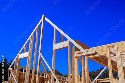 Obraz premium Workers build framework rafters beams of wooden house in construction site.