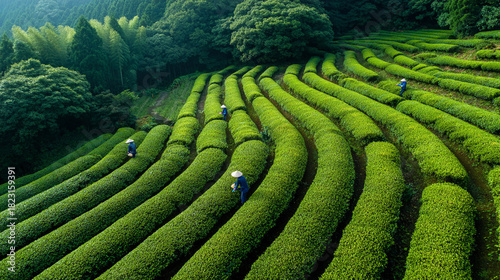 © kusum, Fototapeta premium Workers harvesting fresh tea leaves in a vibrant green terraced plantation under sunlight
