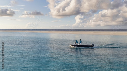 © Wirestock, Naklejka premium Workers heading off to work on atol island.