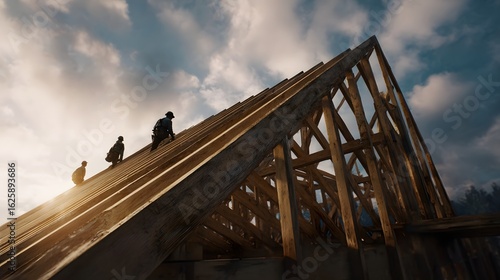 Fototapeta premium Workers installing roof trusses on a construction site