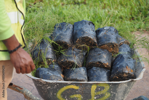 © Towfiqu Barbhuiya , Obraz premium Workers move potted plants in a wheelbarrow