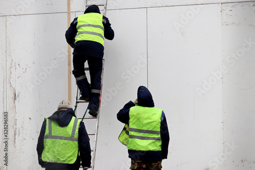 © Oleg, Fototapeta premium Workers near the wall of a building under construction. Man in uniform climbs the ladder