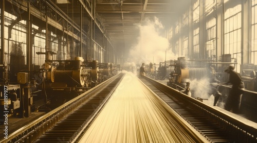 © Priyanut, Obraz premium Workers operate looms; yarn flows; industrial setting.