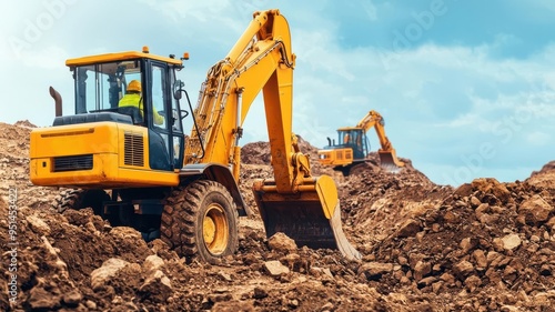© JAYDA RIN, Obraz premium Workers operating a backhoe on a construction site, flat color vector, rugged palette