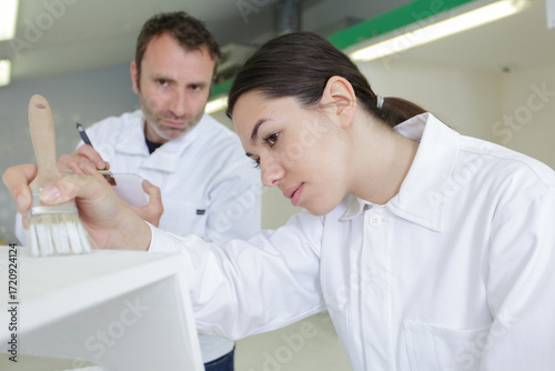 © auremar, Obraz premium workers varnishing wooden plank with oil