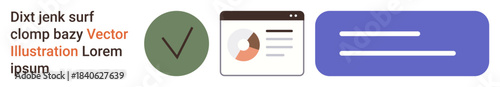 Fototapeta premium Workflow design, user interface, business data, app layout, productivity tools, UI components. Checkmark circle, profile dashboard card and abstract button. Workflow design and productivity tools
