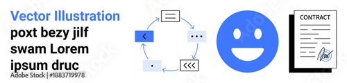 Fototapeta premium Workflow management, business processes, customer satisfaction, agreements, visual design, corporate communication. Circular flowchart, smiling face contractual paper. Workflow and agreements