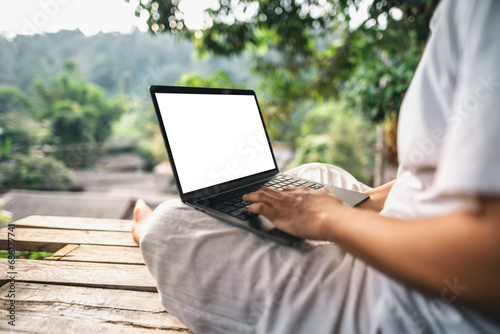 Fototapeta premium Working on a laptop on the balcony of a country house