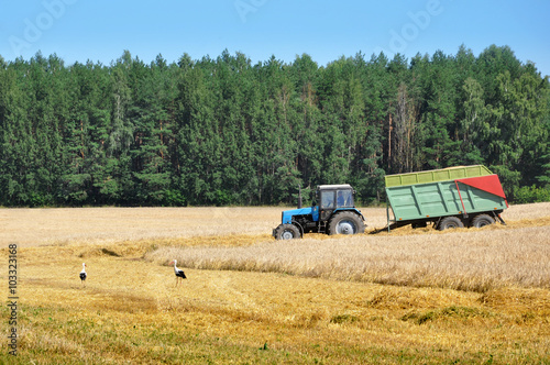 Obraz premium Working tractor and two stork on a wheat field.