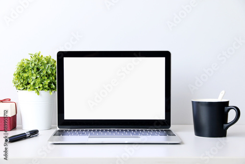 Fototapeta premium Working with Laptop computer,Hot coffee and cactus copy space on desk background,business Concept
