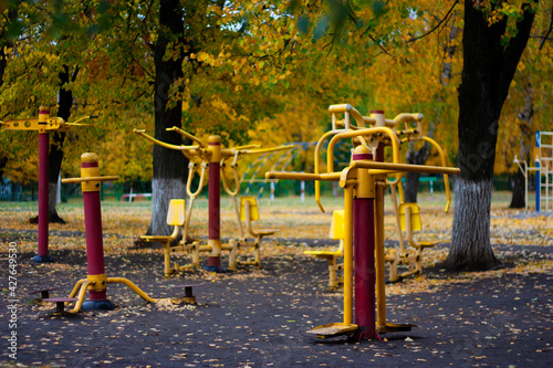 Fototapeta premium Workout fitness facility playground with metal sports equipment outdoors on a nice autumn or fall day