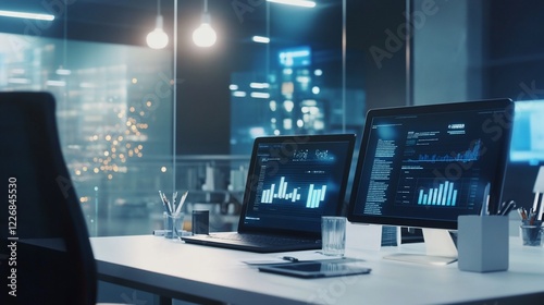 © adha, Fototapeta premium Workplace analysis featuring two monitors displaying data and a city view at night