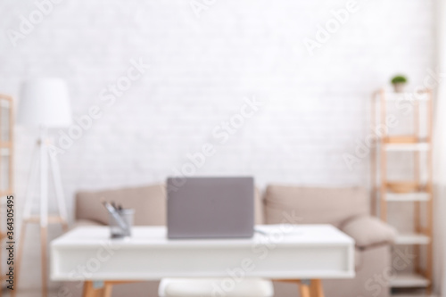© Prostock-studio, Fototapeta premium Workplace at home. Notebook and stationery on white table in interior