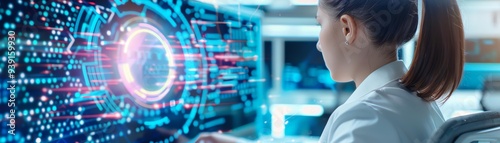 © farland9, Obraz premium workplace promoting women in tech, representing gender equality in technology fields, with glowing light effects illustrating empowerment in STEM.