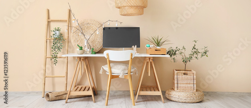 Obraz premium Workplace with computer and Easter decor near beige wall in office